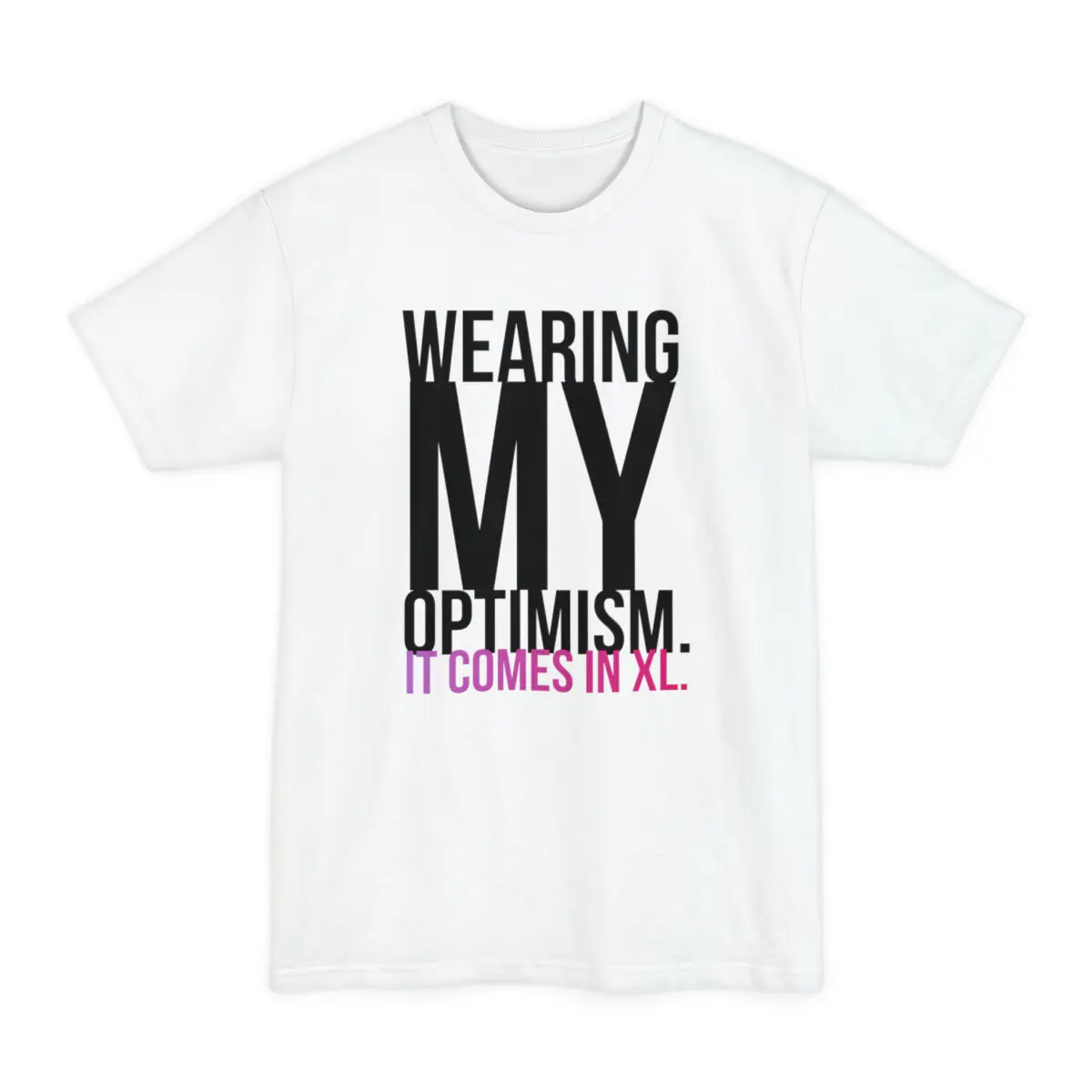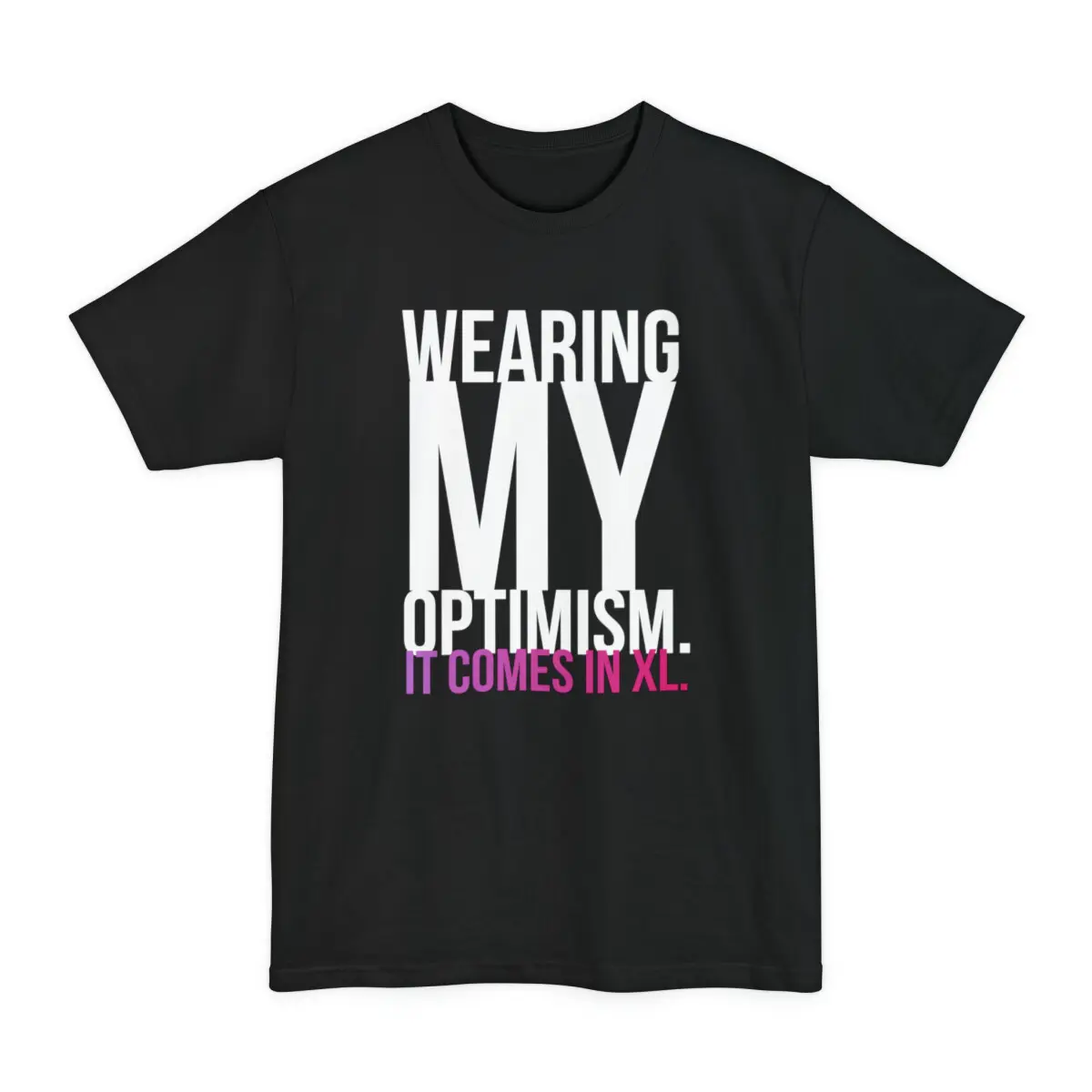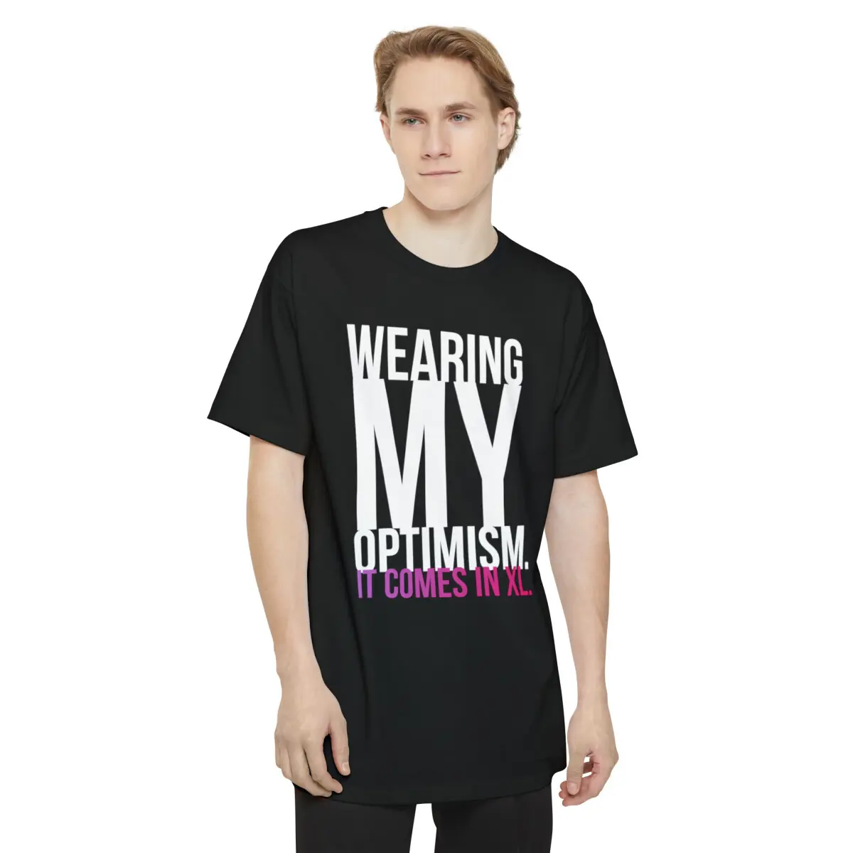 Say it with yo SHIRT! Optimism comes in all shapes and sizes. Bold Statement Beefy-T® T-Shirt – Optimism. This shirt is a taller take on the classic Hanes t-shirt, the Tall Beefy-T® is three inches longer than the regular size. Available in special sizes from LT (Large Tall) to 4XLT. The shirt has a full cut and a generous fit for comfort.
