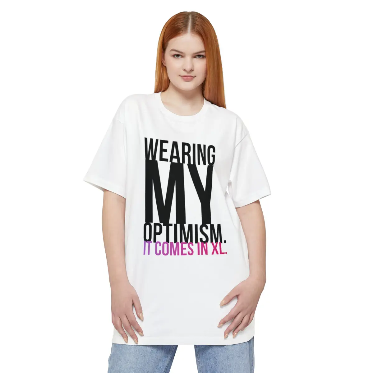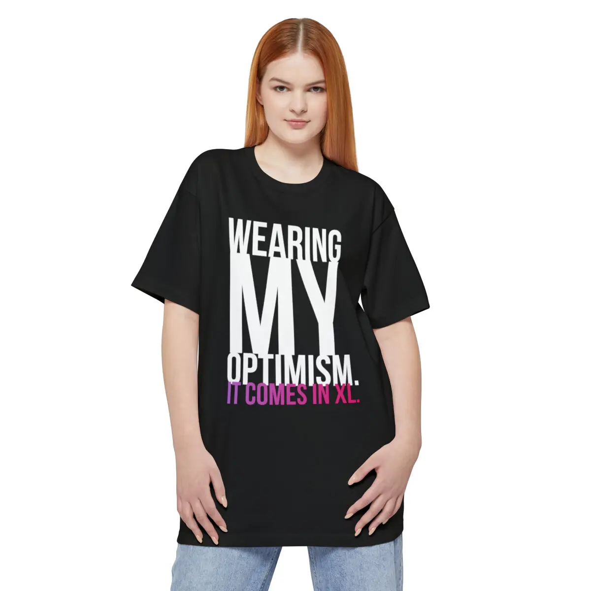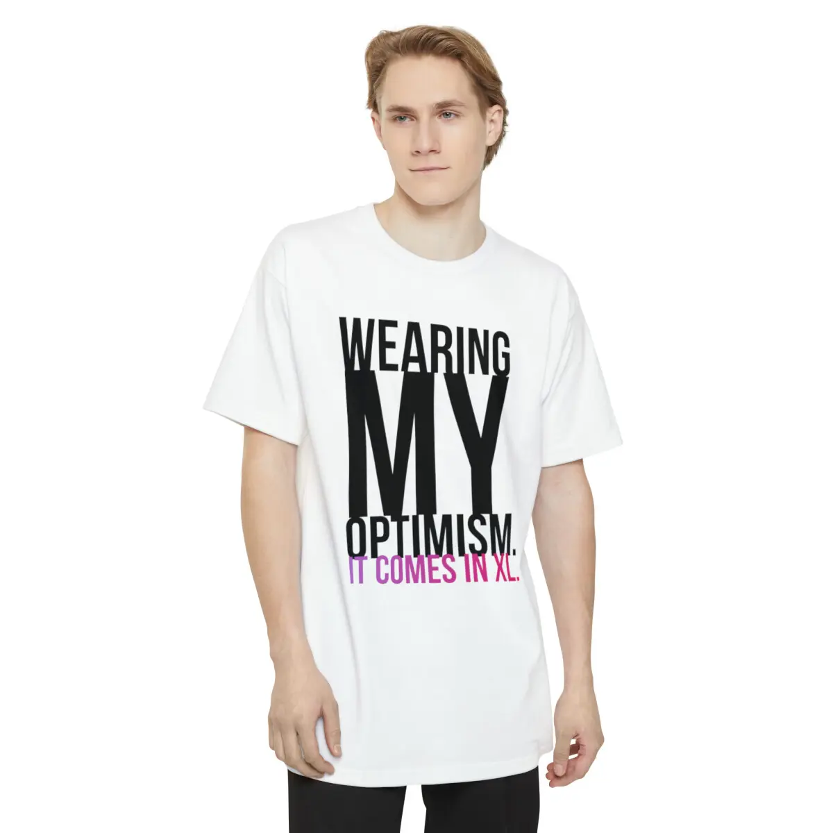 Say it with yo SHIRT! Optimism comes in all shapes and sizes. Bold Statement Beefy-T® T-Shirt – Optimism. This shirt is a taller take on the classic Hanes t-shirt, the Tall Beefy-T® is three inches longer than the regular size. Available in special sizes from LT (Large Tall) to 4XLT. The shirt has a full cut and a generous fit for comfort.